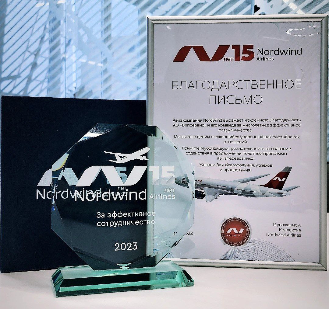 5 декабря 2022 года авиакомпании Nordwind Airlines исполнится 15 лет! В честь такого значительного юбилея, авиакомпания решила выразить свою благодарность партнерам и холдингу Випсервис. Именно Випсервис стал первым, кто получил благодарственное письмо от авиакомпании Nordwind с памятной статуэткой «За эффективное сотрудничество» .